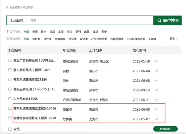 从OPPO的官方招聘网站上可以看到,尽管OPPO否认入局造车,但从今年5月开始,OPPO开始招聘电动汽车相关的技术人才,岗位涉及智能驾驶规控算法工程师和整车系统集成测试工程师,工作地点分别在上海和重庆。