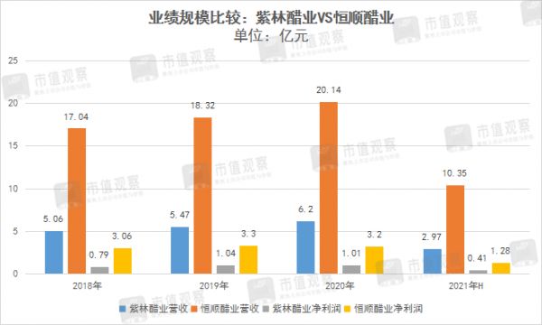 当然,恒顺醋业的业绩还包括一部分料酒等其它产品,仅食醋产品而言,根据第三方数据统计,2020年紫林醋业的市占率为4.3%,恒顺醋业则为10%左右,后者也是公司的2倍多。