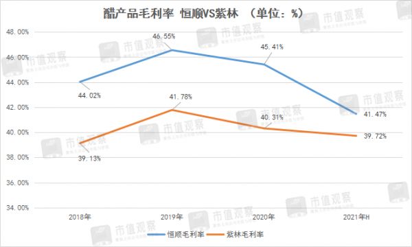 财报数据显示,就单一的“食醋”产品毛利率而言,报告期内,紫林醋业均落后于恒顺醋业。
