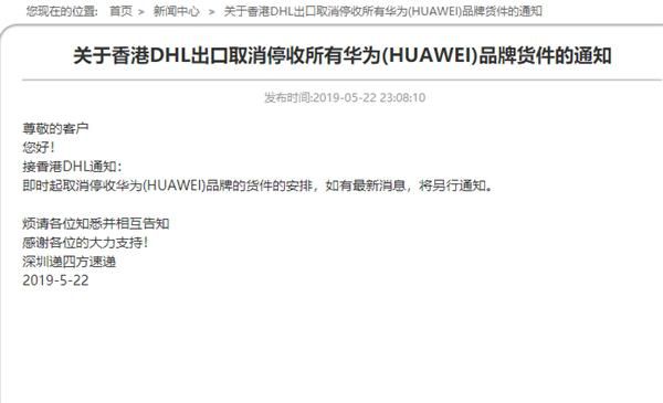 此前在5月22日,递四方官网曾发布通知称,香港DHL停收华为品牌货件。通知称:接香港DHL通知:接到香港特别行政区政府相关部门通知,即时起停收所有华为(HUAWEI)品牌的货件,直至另行通知。不过5个小时后递四方官网发布公告称DHL香港取消了这一决定。