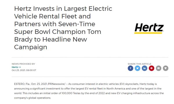 电动汽车有史以来最大一笔交易,汽车租赁巨头Hertz将购买10万辆特斯拉