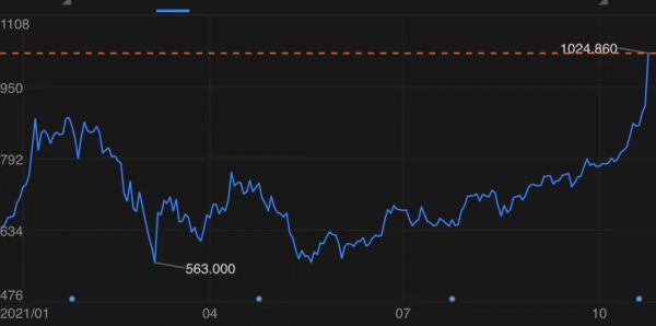 受以上消息影响,特斯拉股价继上周五创出历史新高后,周一继续大涨12.7%,突破1000美元关口达1024.86美元,市值上一夜之间暴涨1154亿美元(约合人民币7369亿元),突破万亿美元达1.03万亿美元(约合人民币6.58万亿元)。