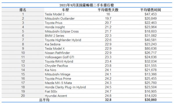 由于供应链危机以美国的税收补贴政策,Model3在二手市场上大受青睐。由上表可知,二手Model 3平均只需要16天就可以成交,这大约是行业平均水平的一半,比排名第二的三菱欧蓝德快了近4天。