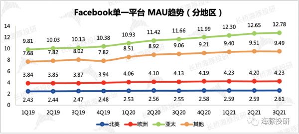 三季度Facebook单一平台用户增长环比略有放缓,贡献最大的仍然是亚太地区,全球净增1600万人。