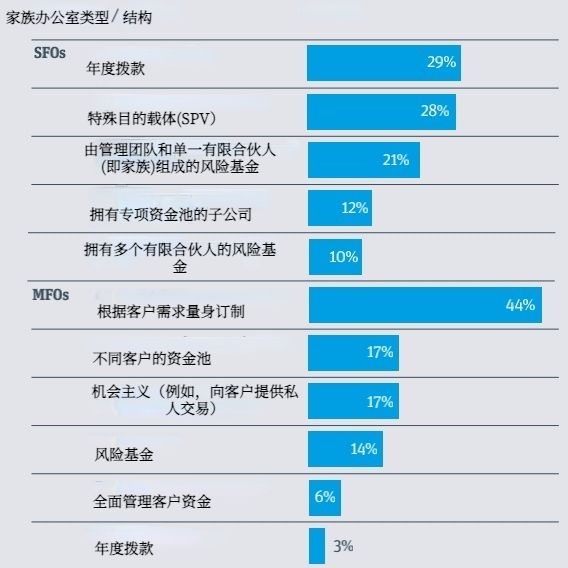 通常,单一家办布局风投时采用多种结构,包括年度拨款(相关参与者的29%)、特殊目的载体(SPV,以在机会出现时加以利用,28%),以及由管理团队和单一有限合伙人(即家族)组成的风险基金(21%)。