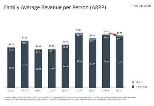 在关键用户指标上,Facebook的三季度日活用户为19.3亿,持平或略高于预期,同比增6%,但更被关注的月活用户为29.1亿,逊于分析师预期的29.3亿,去年同期近27亿。衡量货币化用户群能力的另一核心指标:每用户平均收入(ARPU)为10美元,同样逊于市场预期的10.15美元。