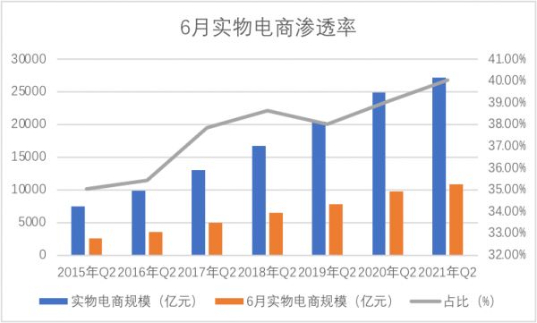 2020-2021两年中6月实物电商规模占当季度电商规模比重迅速上扬,联系到彼时线上零售总规模仍处于下行压力放大的时间窗口,618作为大促很大程度上稀释了外界环境恶化对电商和零售业的冲击。
