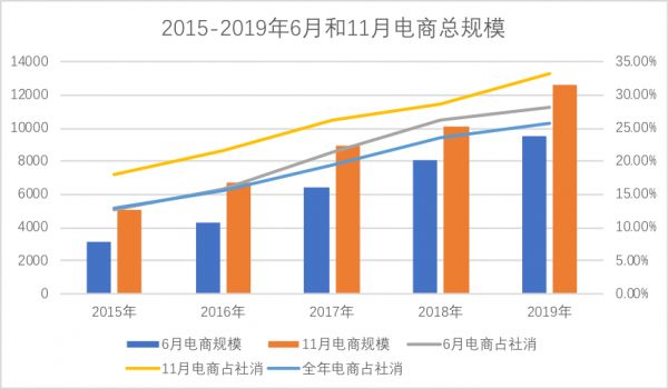 无论从规模抑或是占当月电商规模比重,双十一都要超越618,如果在扩内需中618对于上半年经济起到了积极的效应,那么双十一在接下来的价值会更大。