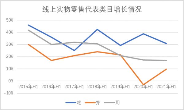 从2015年至今,“穿”这一大品类的线上增长多是在下行通道中,与此同时,“吃”则相对稳定,“用”亦是在下降。