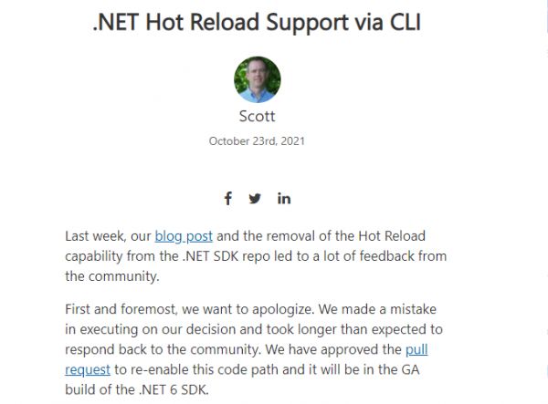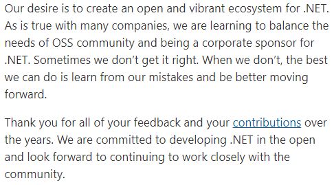 10月23日,微软官方发布博文道歉:“首先,也是最重要的,我们要道歉。我们在执行我们的决定时犯了一个错误,花了比预期更长的时间来回复社区。我们已经批准了重新启用这一代码路径的拉取请求,它将在 .NET 6 SDK 的 GA 构建中出现。”