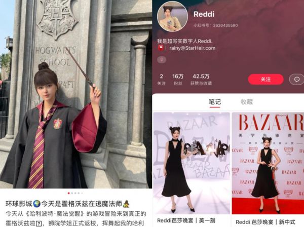 比如手持魔杖身穿狮院校服,站在最近大热的环球影城门口的少女Vila。她的大眼睛、齐刘海和丸子头,就比AYAYI更显得可爱风一些;而“来自2077”的虚拟人ALiCE,以东方式的细长眉眼,拥有花木兰式“高级脸”,一抹过鼻梁的腮红让她极具辨识度。除此之外,还有知性美女类型的RIA,和自称“打工人”的职场时髦精Reddi等等。