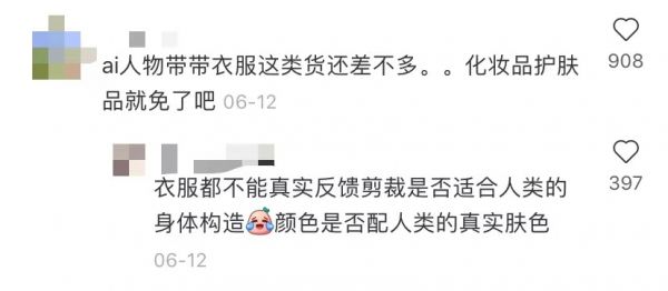更有许多用户表示,无法接受虚拟人做产品推广,觉得他们甚至连衣服的裁剪构造,都没办法进行反馈真实,更别说是皮肤试色的真实度了。