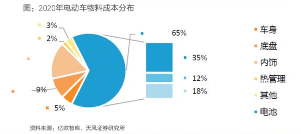 传统汽车中,燃油发动机约占汽车总成本的30%,是占比最高的;同样的在新能源汽车中,电控系统也是成本占比最高的部分,仅电池一项达到汽车总成本的35%,电机、电控占剩余的30%成本。