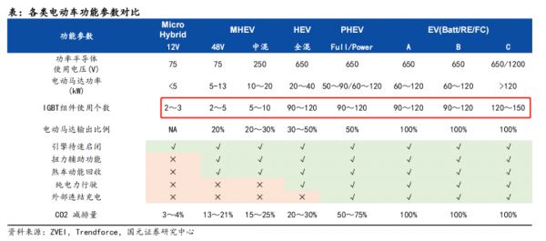 纵观全局,IGBT和MOSFET等功率器件的需求量随着车辆电动化的进程而显著增加。对于电动化很低的微混汽车而言,IGBT组件的个数仅为2-3个,而随着电动化程度的加深,马达功率在120kW以上的电动车IGBT组件的个数可能达到150个。
