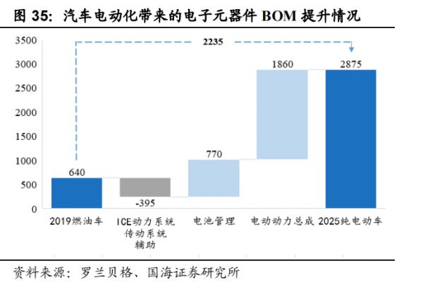 具体来看,虽然内燃机被更替,汽车将减少395美元的电子元器件,但电池控制和电动力总成却分别增加770美元和1860美元的电子元件成本。