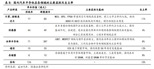 一辆新能源汽车中,功率半导体的自主率仅为8%,储存芯片的比例也为8%,信号链芯片和传感器的自主率不足5%,控制类芯片的自主率甚至不足1%。整体来看,中国车规半导体的自主率在8%以下。