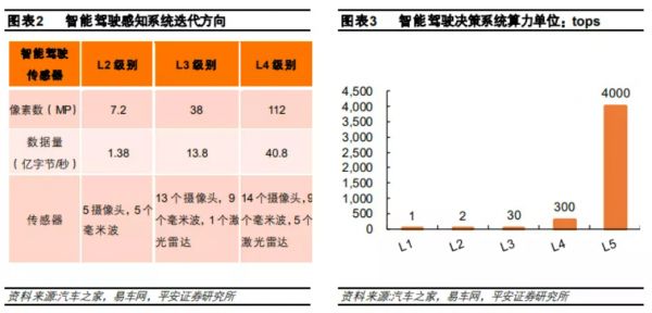 尤其是自动驾驶技术,从L3到L5阶段,计算量都将指数级增长,对于芯片算力的要求将是如今的上百倍。雷达芯片、传感器、储存芯片、计算芯片都极有可能出现巨大的缺口。
