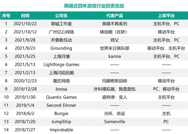 但若与自身相比,网易无疑打破了此前缓慢的投资节奏,转而在全球市场搜罗标的。今年内,网易投资的游戏厂商遍布中国、日本以及英国,产品上架平台涵盖了主机、Steam以及移动平台。