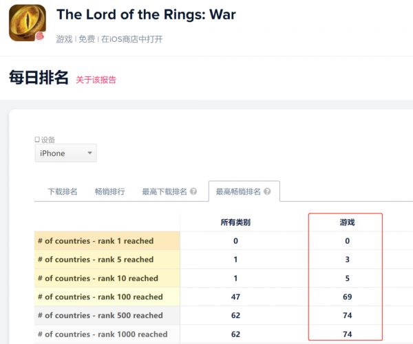 其中《指环王:崛起之战》最高曾拿下69个国家及地区的iOS游戏畅销榜TOP100,榜单表现尚可。