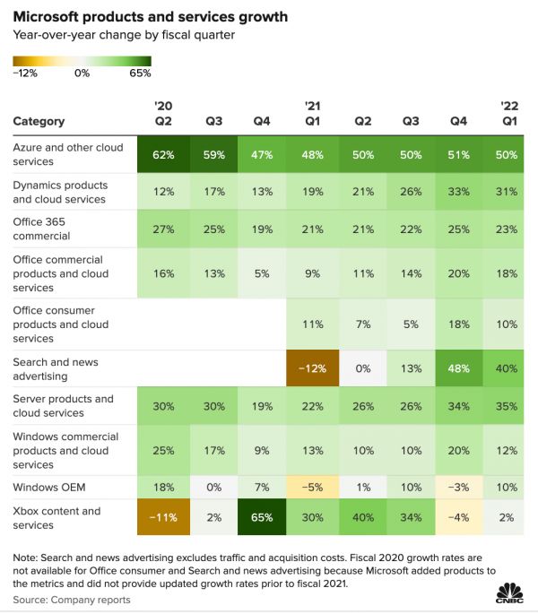 在本季财报中,微软的各项主要业务都实现了正增长,其中Azure智能云业务更是连续第四个季度维持在50%以上的增速上。