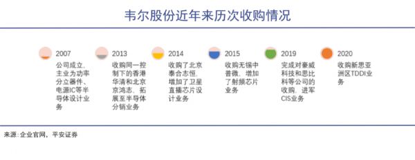 自2007年成立以来,韦尔股份一路通过资本并购扩充体量。到2019年将豪威科技收入囊中,挺进CIS(CMOS图像传感器)业务。