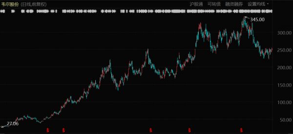 “以小博大”收到奇效,韦尔股份自此开启一波令人惊叹的长牛行情。股价由2019年的30元左右一路飙升至今年7月的345元,上涨超10倍。