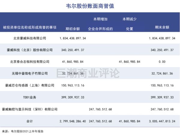最为明显的就是商誉,截至2021上半年,韦尔股份账面商誉达到30亿元,其中18.34亿元来自威豪科技,3.4亿来自思比科微,3.99亿来自TDDI业务。
