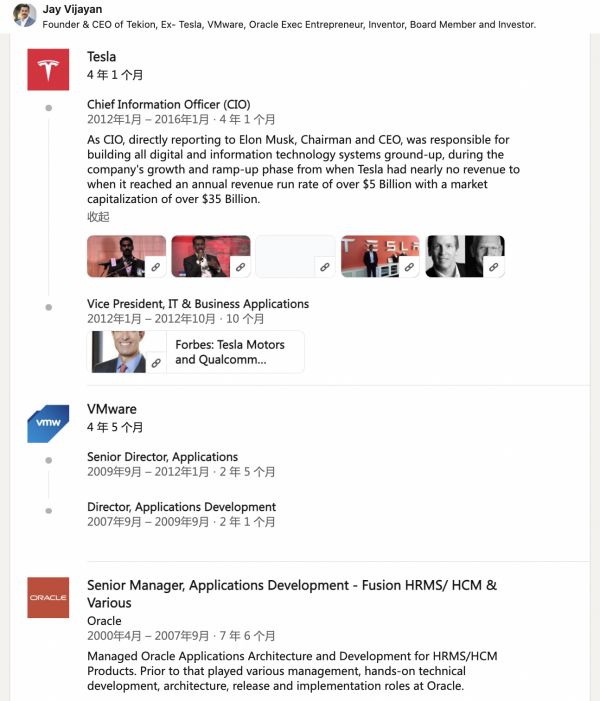 几任CIO任职时,均有超过10年的IT行业经验。可以说,特斯拉的CIO岗位并不相信“年轻有为”。毫无疑问,特斯拉以及知名的汽车主机厂,均不缺IT采购的预算与费用,之所以放弃采用成熟的商业软件,一定是因为业务的场景复杂度或者创新度高,市面上产品无法解决实际问题。历任CIO中,Jay Vijayan知名度最高,主要是因为从0到1打造了Warp系统,与其在Oracle和WMware十年的工作经验密不可分。