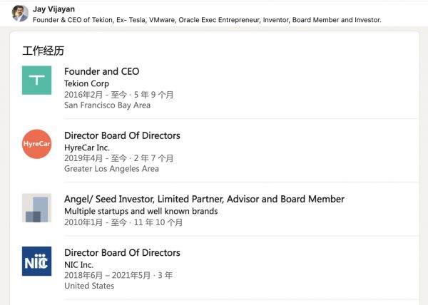 事实上,Ganesh V. Iyer 很可能是被Jay Vijayan 在2012年一起带入特斯拉的。LinkedIn页面资料显示,Ganesh V. Iyer 2010年11月至2012年2月期间担任VMware 的项目总监。