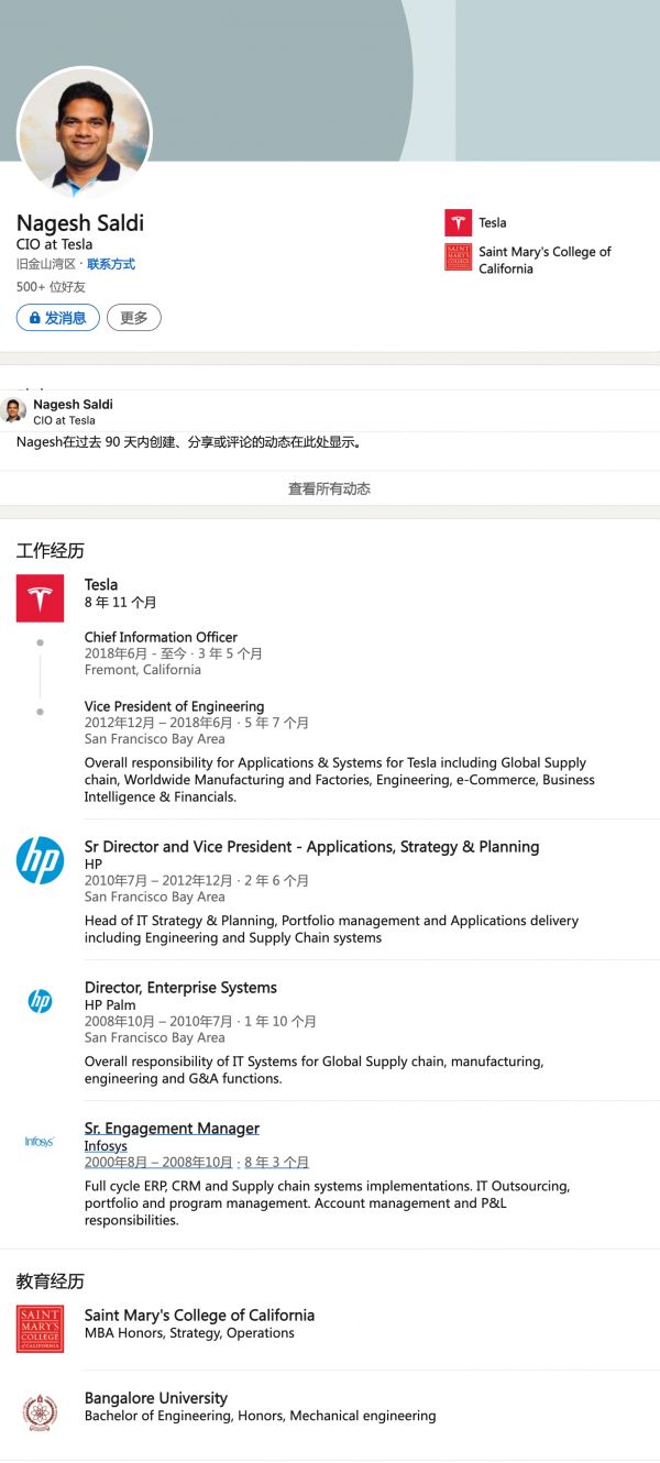 2012年底,Nagesh Saldi就加入了特斯拉,做到了工程部副总裁,全面负责特斯拉的应用和系统,包括全球供应链、全球制造和工厂、工程、电子商务、商业智能和财务等。2018年,随着Gary Clark离职,成为新任CIO。