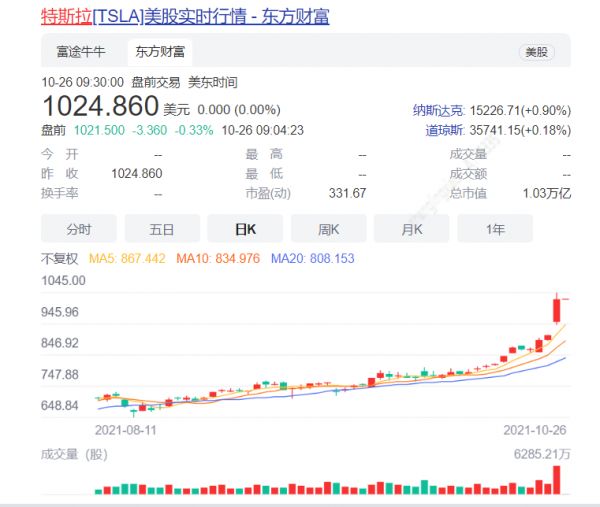 特斯拉市值1万亿人民币,超中国A股车企市值总和