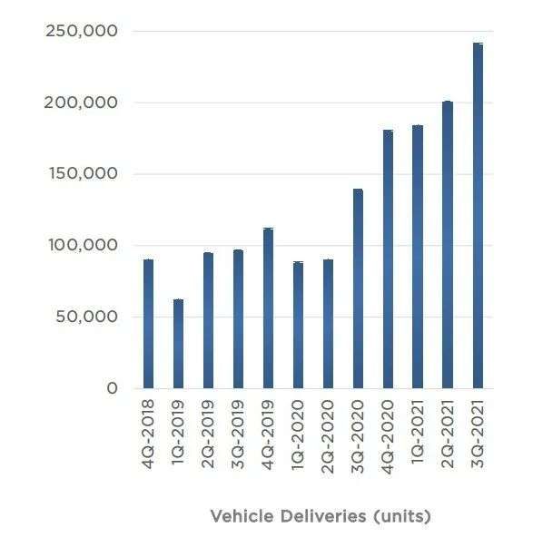 财报数据显示,第三季度,特斯拉产量达23.78万辆,同比增长64%。特斯拉在全球共交付电动车24.13万辆,同比增长64%。其中,Model3/Y三季度交付量为232,102辆,同比增长87%,占特斯拉特当期总交付量的96%。特斯拉预计,到今年年底将实现年产1百万辆汽车的里程碑。