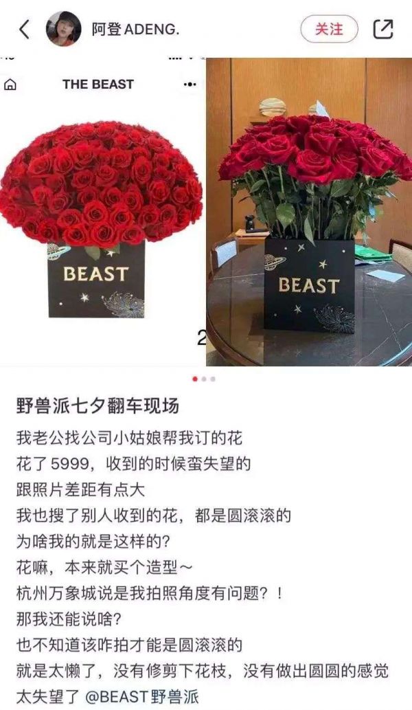 还有售价5999元的野兽派玫瑰,卖家秀和买家秀简直天壤之别。在社交平台上,类似这样的吐槽数不胜数。