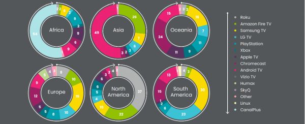 注:流媒体电视领域的主要公司及其在世界范围的市场份额。从图中可见,Roku公司的代表色是灰色,只在北美占据37%的份额,在其他地区份额较小(来源:Conviva报告)