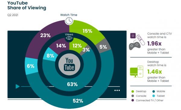注:使用不同设备观看YouTube视频的用户比例和观看时长(来源:Conviva报告)