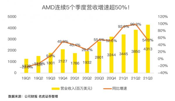 具体来看,AMD三季度营收43亿美元,同比增长54%,超出公司在二季度财报中给出的40-42亿美元的区间预测值,更远远高出分析师一致预期的41.16亿美元。这已是AMD连续5个季度营收同比增速超过50%。