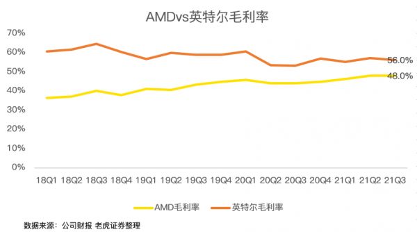 从盈利能力上看,AMD与老对手英特尔尚有差距,同时也意味着AMD还有很大的提高空间。
