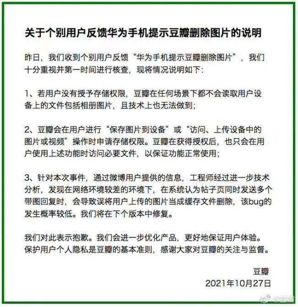 近日,有网友称其保存在手机相册的图片,无故被豆瓣 App 删掉,需要从回收站内才能找回。对此,豆瓣发布公告,称关于个别用户反馈“华为手机提示豆瓣删除图片”,在网络环境较差时,系统认为帖子页同时发送多个带图回复时,会导致误将用户上传的图片当成缓存文件删除,该 bug 的发生概率较低,将在下个版本修复。豆瓣表示,若无用户授权,豆瓣不会读取设备上的图片,且技术上也无法做到;保存图片时会申请储存权限,访问必要文件。(新浪科技)