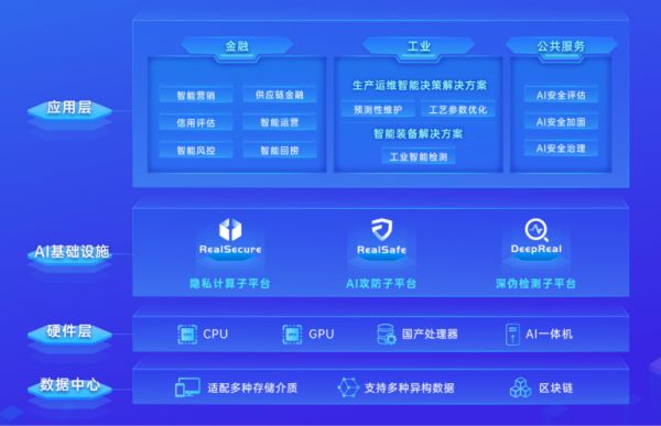 在数据方面,瑞莱智慧基于安全多方计算、联邦学习、匿踪查询等技术打造了数据安全共享基础平台—隐私保护计算平台RealSecure。区别于市场上众多的隐私计算产品,瑞莱智慧在底层原理和技术架构层面开展了大量工作,主要聚焦于三点:自主研发联邦AI编译器实现了机器学习和分布式联邦学习生态的统一;持续优化高效加密算法使性能较业内平均水平提升数十倍;提供全方位的安全评估验证能力,可细粒度展示执行流图。