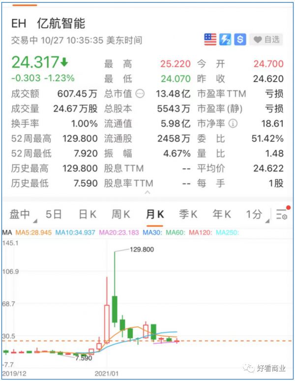 亿航IPO时,其主要收入来自城市空中交通(包括载人交通和物流运输)。2020年,这块业务营收1.06亿元,在公司总营收中占比近59%。在2021年初,亿航股价最高蹿升至129.8美元,总市值达67.91亿美元。