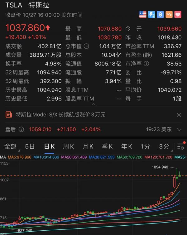 上周五市值才刚刚达到9000亿美元的特斯拉,周一(当地时间10月25日)股价大涨12.66%,总市值高达1.03万亿美元。这意味着,特斯拉成为苹果、亚马逊、谷歌和微软之后万亿美元俱乐部新成员。