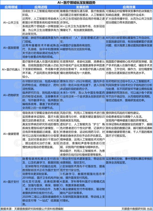 目前,我国的AI+医疗主要应用于医学影像、辅助医疗、药物研发、健康管理、疾病预测等五大领域。