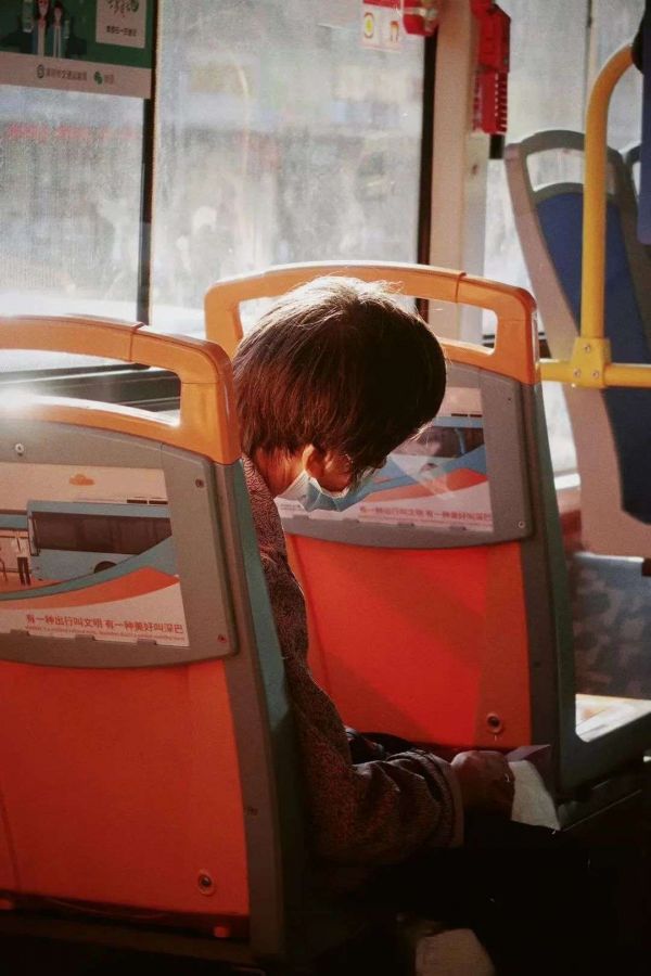 阳光穿透车窗,与老人的发丝交织