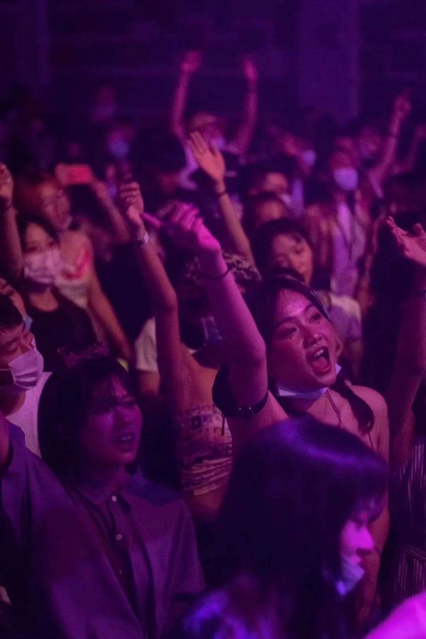 有5、6岁的小朋友戴着比自己头还要大的帽子,左手使劲拽妈妈的衣角,右手指着台上唱「今夜老婆不回家」的怪叔叔们;一对目测四十左右的叔叔阿姨,男穿西服,女着正装,十指相扣,在吧台旁相依摇摆;一个辣妹闭着眼睛,静静地站在原地,享受房间里回响的音乐,而身边的人群都在不同程度地扭动着,这场面有点吊诡,但又意外地和谐......