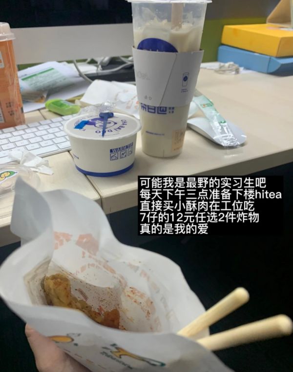 我们还立志带所有正职员工在「奶茶致胖」的路上一去不复返。每天下午在奶茶开车群里吼一嗓子,配上美味的小酥肉,快节奏、让人窒息的工作,瞬间得到了有效的缓冲。