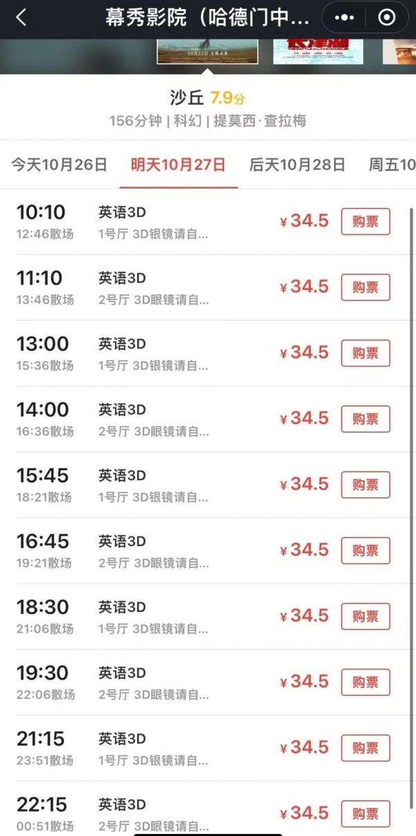 网友反映,这样的情况在二三线城市尤甚。《沙丘》上映期间,每天最多只有一场2D排片,无排片才是常态。仅有的一场的开场时间在早晨8点,甚至要在商场运营前去观看,十分不便。