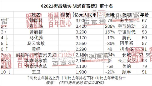 跟在钟睒睒身后的,有抖音创始人38岁的张一鸣、以3400亿元的财富居于第二位;新能源汽车电池供应商宁德时代曾毓群位列第三,财富3200亿元。