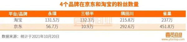 据《壹览商业》统计,截至今年10月20日,在京东和淘宝两大电商平台上,雀巢分别拥有451.8万和237万的粉丝量,隅田川在京东的粉丝量接近300万,在淘宝的粉丝量超过200万。永璞除了在京东上的粉丝数比三顿半高出40万以外,在两个平台的粉丝数都不如其他三个品牌。