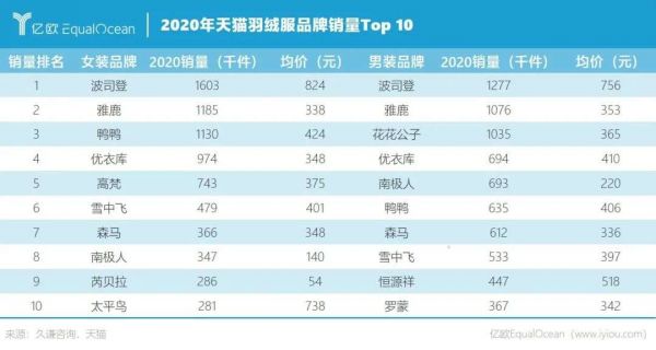 久谦中台统计数据显示,2020年,波司登品牌在天猫男女装羽绒服销量排行中均位列第一,雅鹿均位列第二,花花公子和鸭鸭分别为男女装品牌第三;销量前十的品牌中,除优衣库外,其余均为国产品牌,波司登的均价最高。