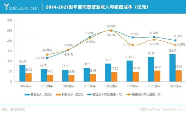 自2018年起,波司登的经营状况开始明显回升。2019财年、2020财年和2021财年,波司登集团经营收入分别为人民币103.84亿元、121.91亿元和135.17亿元,归属股东净利润分别为9.81亿元、12.03亿元、17.1亿元。